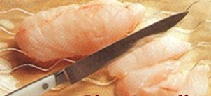 1 Afpuds kalkunbrystet og skær det i ½ cm tykke strimler.
