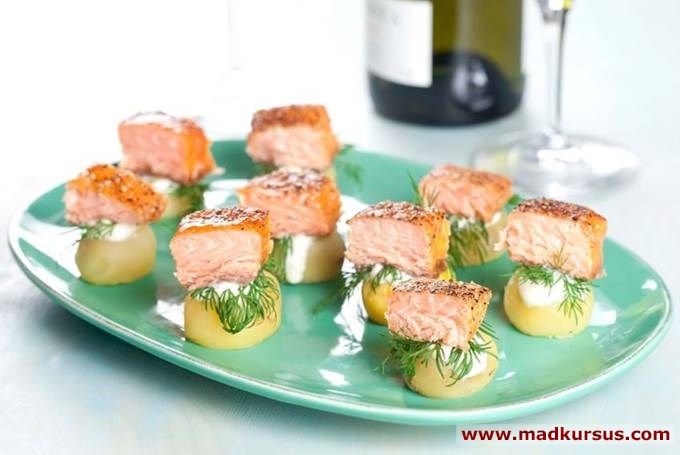 Små lækre hapsere, måske til forretten eller tapasen. Klik her og se, en god opskrift på laks til forret. Nye kartofler med laks, dild og creme på kun 20 min.