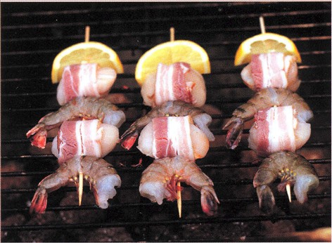 Sæt skiftevis kammuslinger, rejer og citronbåde på hvert spid.