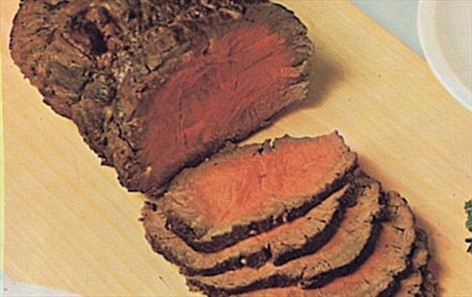 En istandgjort oksemørbrad på ca. 2 kg snøres med garn, brunes i olie og sættes til afkøling.