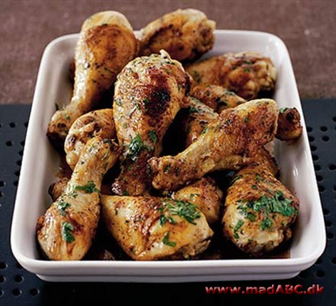 Læg skindet på plads, krydr med salt og peber, og steg kyllingestykkerne i ovnen ved 200°C i ca. 1 time.