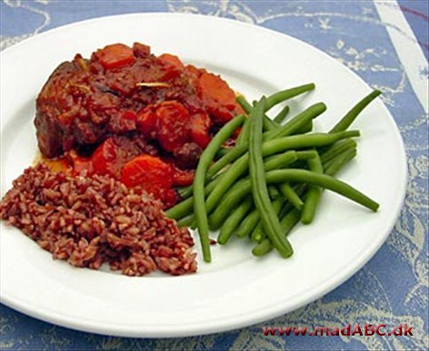 Bring retten i kog og lad det koge for ganske svag varme i 1 ½ time under låg. Spæd med vand/bouillon undervejs og vend kødet ved samme lejlighed.