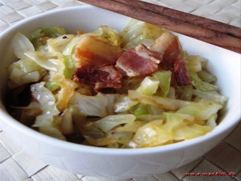 Rist dem sprøde på tør pande og hæld dem med fedtet over den færdige kål, der er anrettet i opvarmet fad.