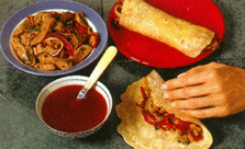 hoisinsauce eller sweet chilisauce. Smør lidt sauce på pandekagen og læg lidt