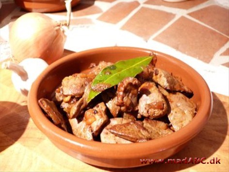 Kom mere fedtstof på panden og rist de udskivede champignoner og finskårne løg heri. Fordel det over leveren.