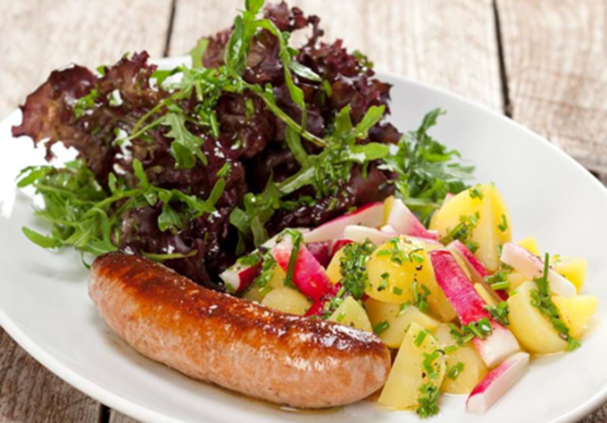 Grillede pølse med kartoffel-radise salat og blandede salater. Lækker menu til varme grillaftener. Klik her og se opskriften. Til 4 personer på 20 min.