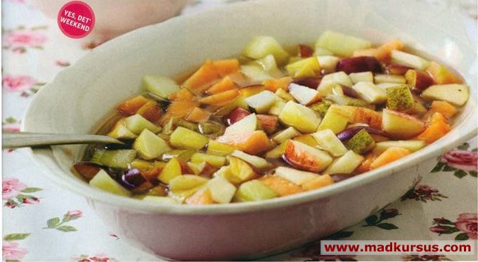 af melon, fersken, pære og æble. Husk, at råcremen skal tilberedes umiddelbart