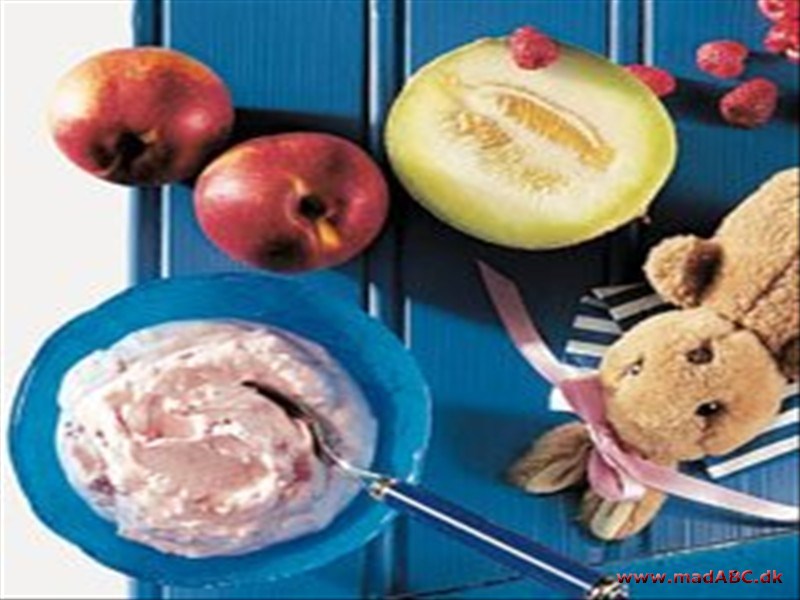 Rør den afdryppede yoghurt i hindbærrene og vend flødeskummet i.