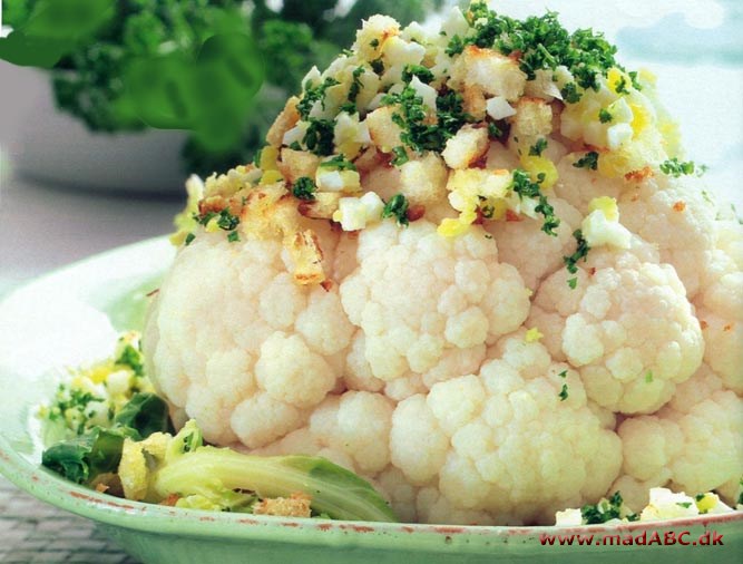 sådan cirka et helt blomkål med hakkede æg og persille eller purløg.