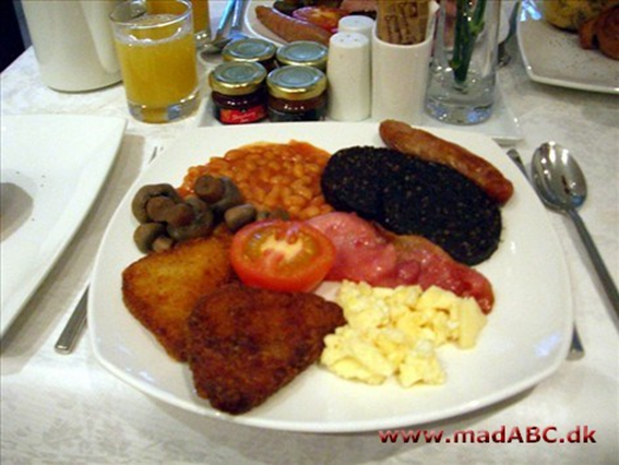 På billedet vises: A full English breakfast with scrambled eggs, bacon, sausages, black pudding, mushrooms, baked beans, hash browns, and half a tomato