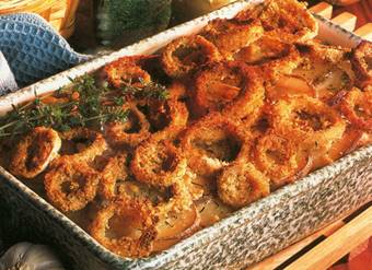 En delikat kartoffelret! Dækket med sprøde løgringe, som gør