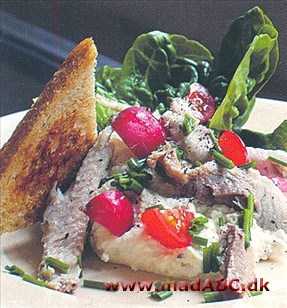 Rør rygeost med mascarpone, sennep, purløg, salt og peber.