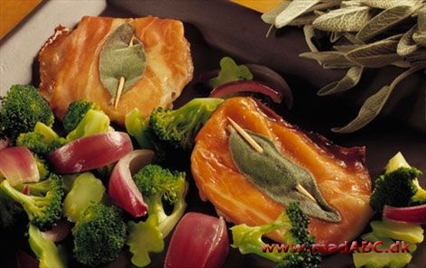 Læg på hvert kødstykke en skive ost, en skive spegeskinke og øverst et salvieblad.