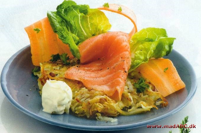 Anret de sprøde rösti med salatblade, røget laks, tynde spåner af gulerod og persilledrys.