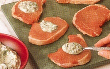 Anvend en spiseske til at fordele osteblandingen på skinken.