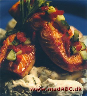 Steg laksen på panden, 2-3 min. på hver side sammen med hakket peberfrugt.