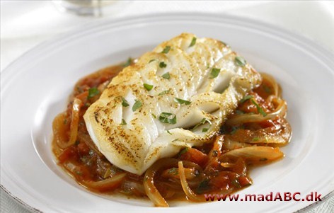 Lad det snurre 5 minutter under låg, læg de halverede torskefileter i og damp dem møre i ovnen - 8-10 minutter under låg ved 225°C.