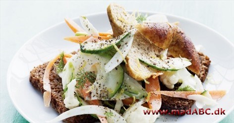 Kom lidt grønsager på rugbrødet sammen med skiver af den stegte torskerogn og lidt revet citronskal.