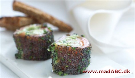 Snit ⅓ af purløgene meget fint og læg dem i en stribe, midt på den lange led af fladen. Rul laks og avocado sammen om purløget, så det bliver en roulade.