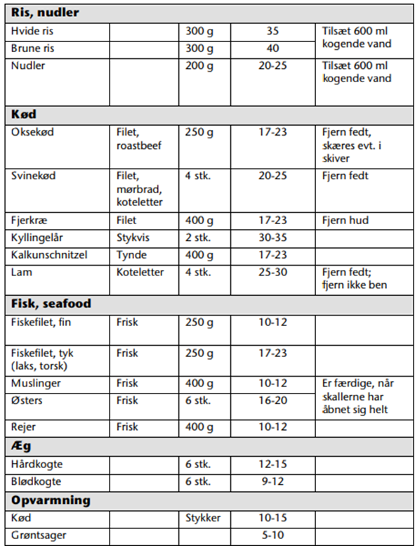 · De afhænger blandt andet af, hvor store fødevarestykkerne er, hvor tykke lag de er placeret i, hvor fuld kogebeholderen er, hvilken kogebeholder de er placeret i og selvfølgelig også af dine præferencer.