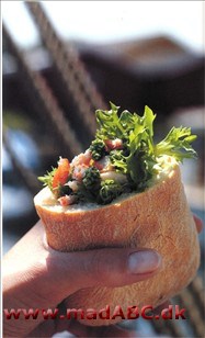 Udhulet bolle med krabbekød, tomat og dildpesto