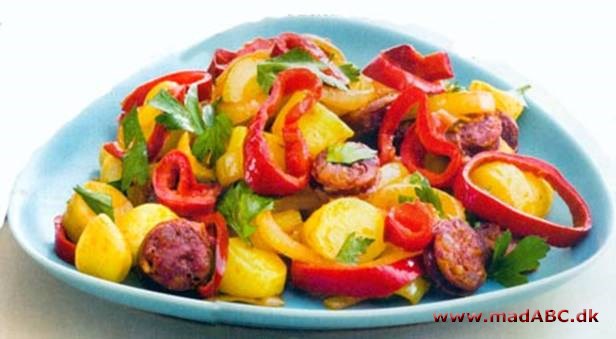 Vend kartofler og persille sammen med grønsager og pølse og varm det hele godt igennem.