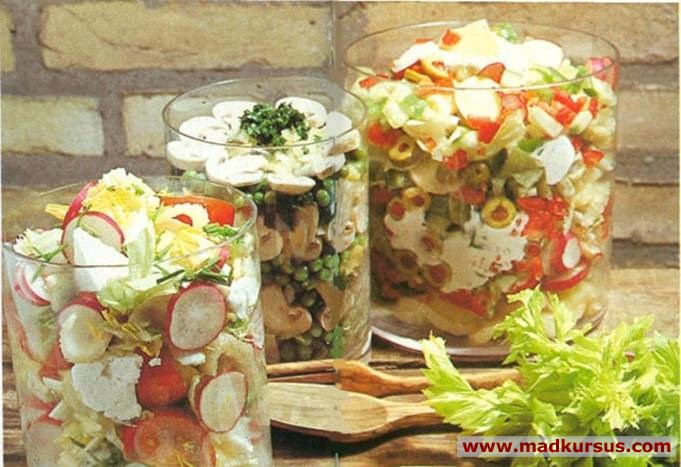 3. Grøn salat med grøn og rød peber, radiser, fyldte oliven og forårsløg. (bagerst)