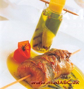 Puds lammemørbrad/filet af og fordel kødet på 4 spid sammen med de forkogte lammebrisler og de flåede lammenyrer.