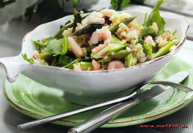 3. Skyl rucolasalaten og slyng den tør. Vend den i den afdryppede bulgur sammen med asparges og rejer.