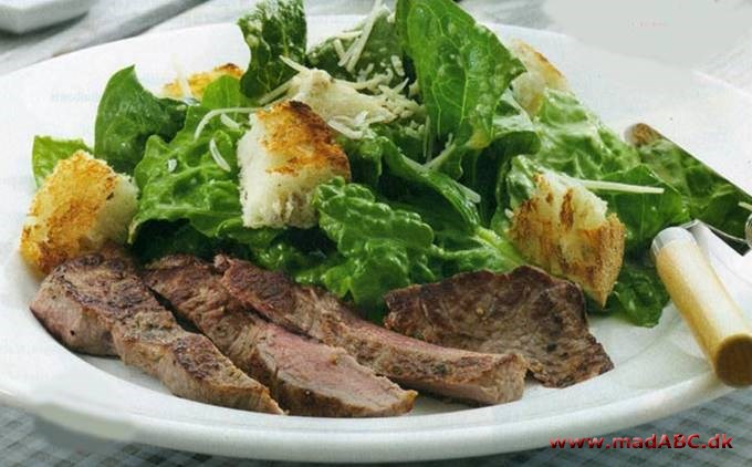 romainesalat, brødcroutoner og den særlige Cæsardressing. Erstat evt. bøfferne