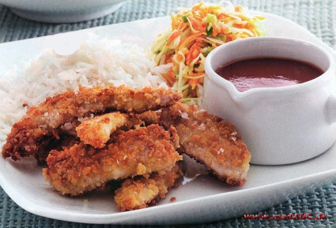 Server de hjemmelavede kyllingenuggets med sursød sauce og en frisk coleslaw af både hvidkål, gulerødder, peberfrugt og forårsløg. Sund og hurtig mad. Et sikkert hit.