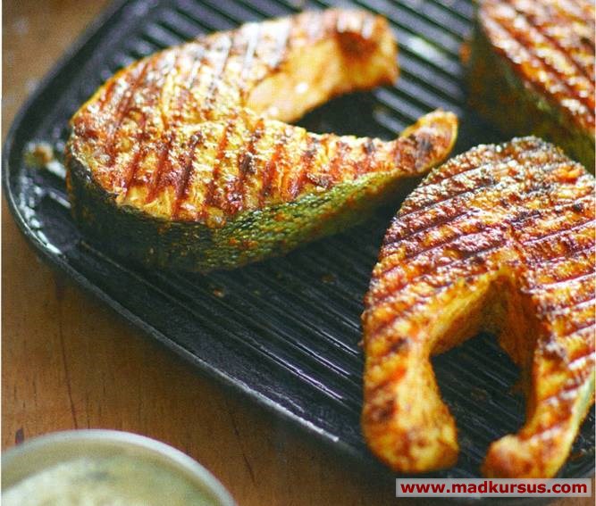 Steg laksen på en varm, oliesmurt grillpande eller på en